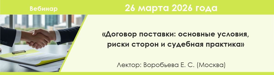 На вебинаре мы рассмотрим порядок заключения договора поставки, а также остановимся на основных условиях. Мы поговорим о рисках сторон договора, которые могут возникнуть при его заключении. Помимо этого, коснемся процедуры изменения и расторжения договора поставки, а также на примере судебной практики рассмотрим возникающие спорные ситуации, показывающие, как суды трактуют те или иные условия договора.